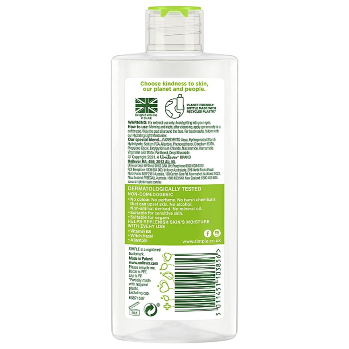 مشخصات اصلی تونر آرامش بخش سیمپل: